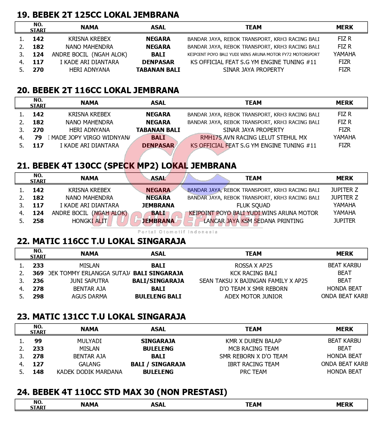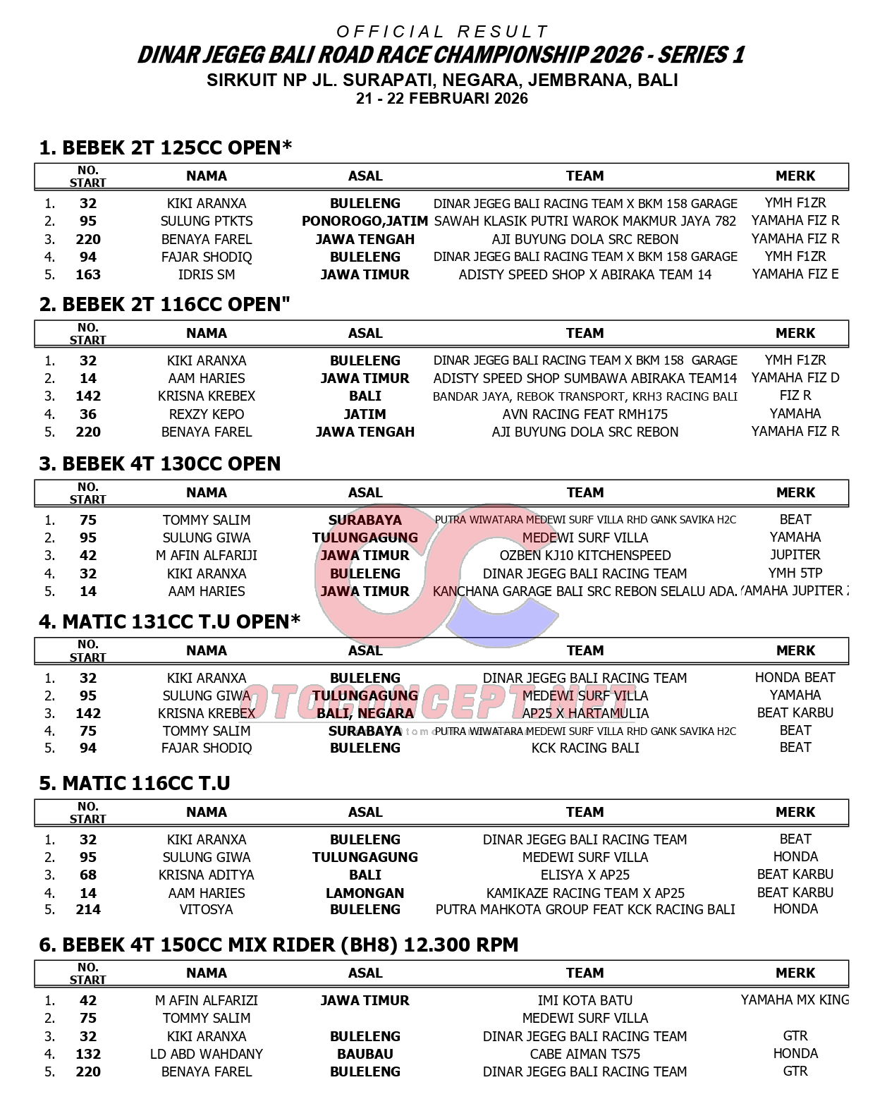 HeadlineRoad RaceHasil Dinar Jegeg Bali Road Race Championship 2026 Seri 1 Admin2 hours ago01 mins OtoConcept.net –Berikut hasil Dinar Jegeg Bali Road Race Championship seri 1 yang berlangsung di sirkuit non permanen Jalan Surapati, Negara Jembrana, Bali (21-22/2). ATH Post navigationPrevious: Cetak Prestasi, SMK Muhammadiyah 1 Kepanjen Raih Juara Umum LKS Kabupaten Malang 2026Leave a Reply Cancel replyYour email address will not be published. Required fields are marked *Comment *Name * Email * Website Save my name, email, and website in this browser for the next time I comment.