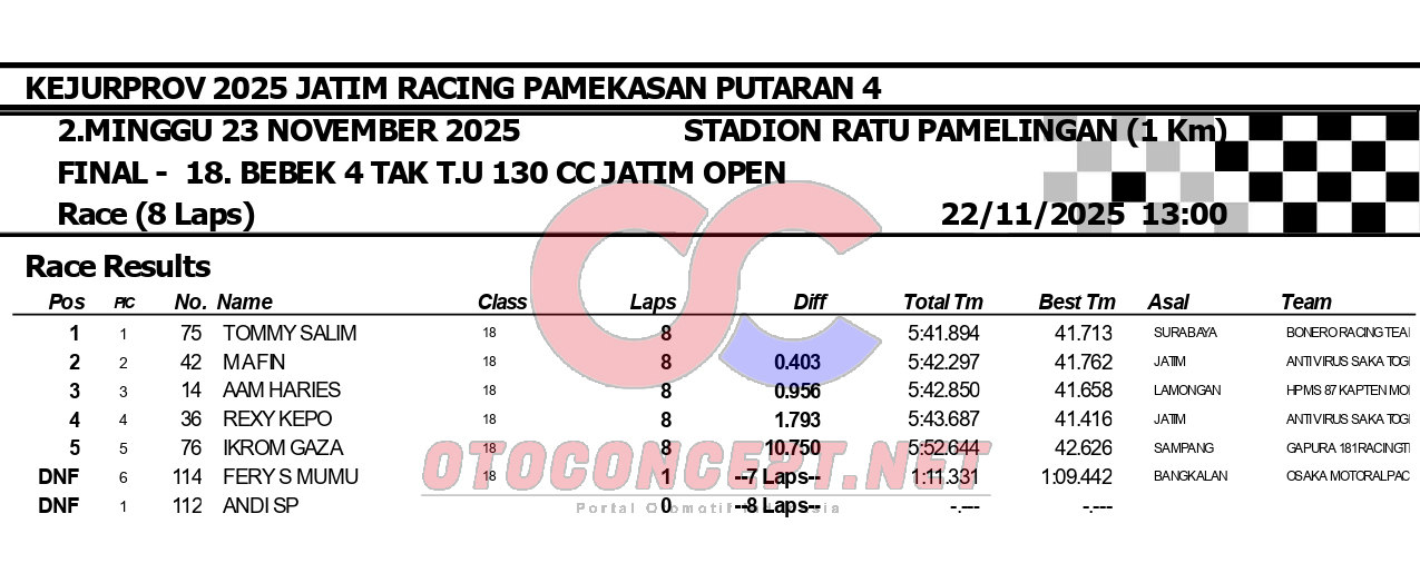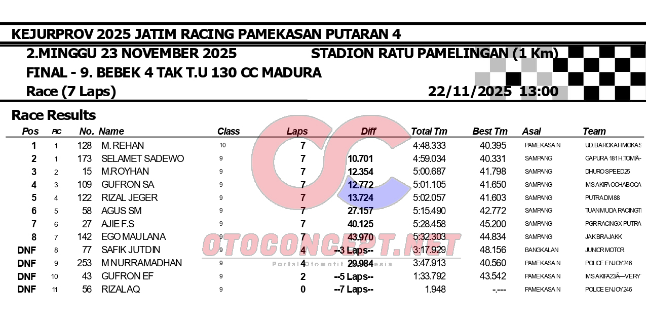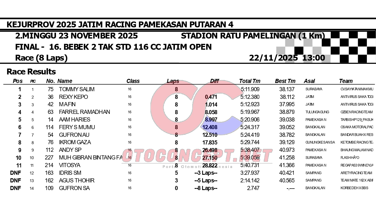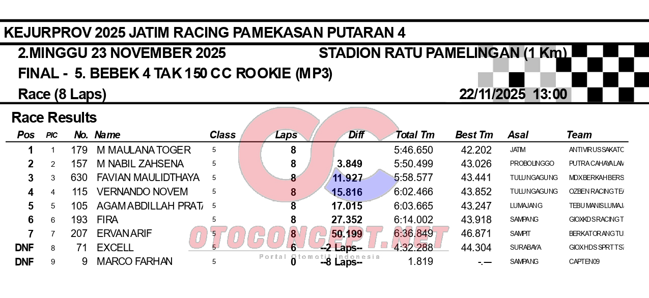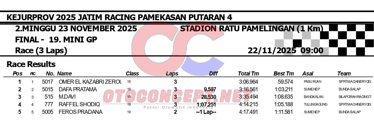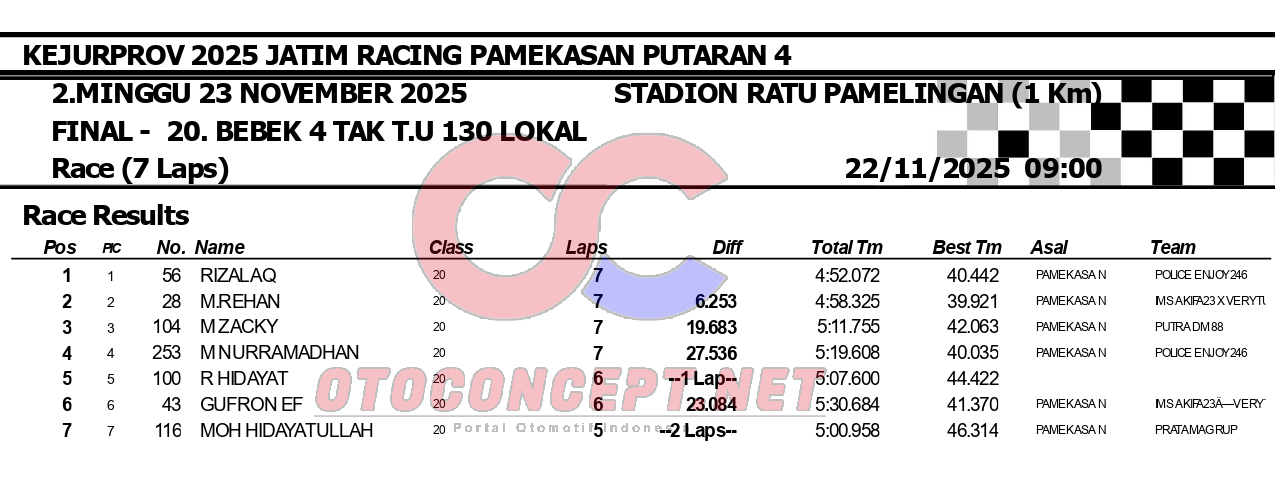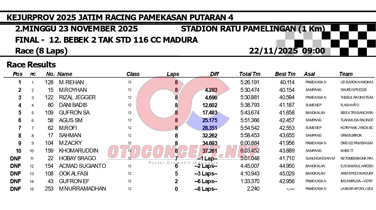 HeadlineRoad RaceHasil Kejurprov 2025 Jatim Racing Pamekasan Admin2 hours ago01 mins OtoConcept.net – Berikut hasil Kejurprov 2025 Jatim Racing yang berlangsung di sirkuit non permanen Stadion Ratu Pamelingan Pamekasan, Madura (23/11). ATH Post navigation Previous: Hasil Superchallenge Superprix Boyolali Leave a Reply Cancel replyYour email address will not be published. Required fields are marked *Comment * Name * Email * Website Save my name, email, and website in this browser for the next time I comment.